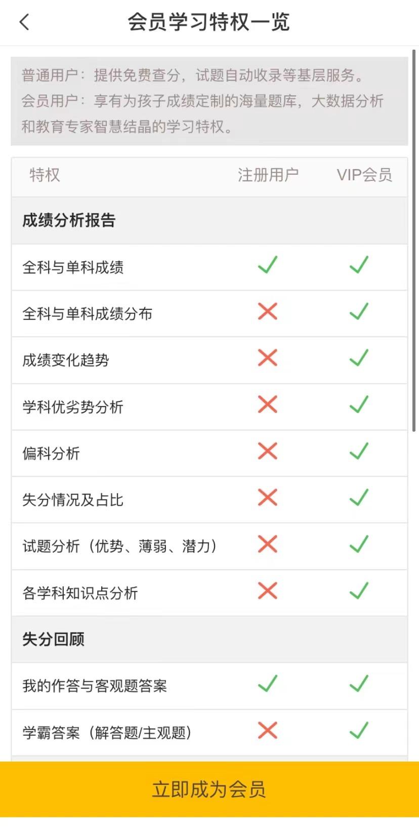 “好分数”软件注册会员仅能查看全科与单科成绩,VIP会员服务则包括成绩分布、失分题答案等,一年的会员价格为488元。