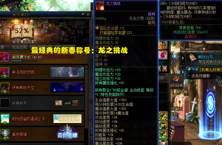 “龙之挑战”,17年新春礼包称号,这可以说是地下城最经典的称号之一,除了称号本身属性优秀外,其实和当时的游戏环境也息息相关。
