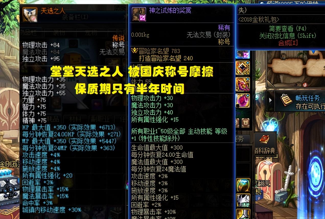 但是,和霸气名字呈现出鲜明对比的是,天选之人的属性表现非常一般,“最终伤害+12%”,在当时的装备体系下,虽然高于龙之挑战,但立马被接下来的国庆称号“神之试炼”按在地上摩擦。