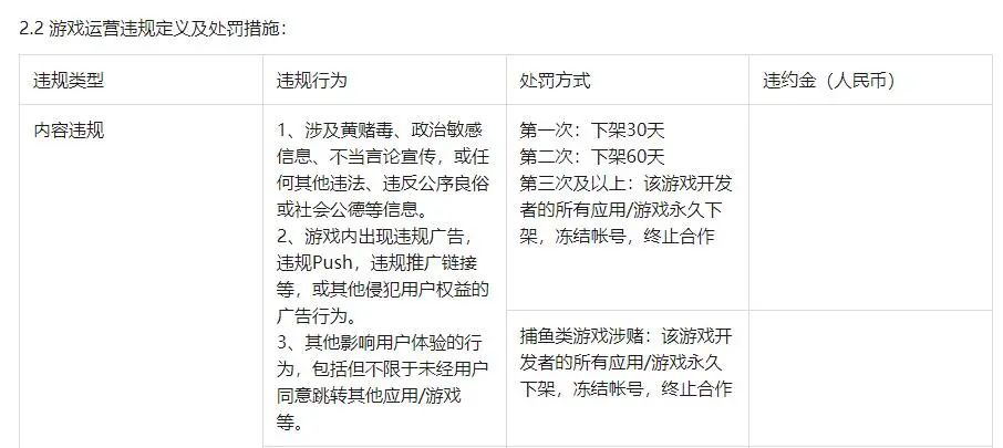 2月中旬,GameLook曾报道,紧随去年11月腾讯系平台宣布暂停所有捕鱼类游戏推广和搜索,国内各主要安卓商店也收紧了审核举措,相继出台新规加强对捕鱼游戏的监管。例如华为应用市场就在联运服务协议中明确对于涉赌的捕鱼类游戏,一经发现将直接永久下架并冻结账号、终止合作。