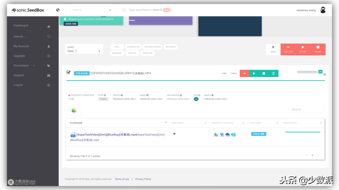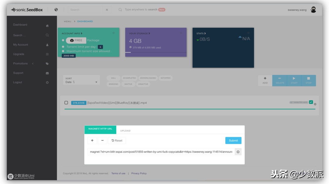 SonicSeedBox 的 UI 设计比较简洁,只需点击右侧的加号,粘贴磁力链接或上传 BT 种子文件,就可以开始离线了。如果是比较热门的资源,速度也非常快。不过免费用户每天仅能离线 2 次,单文件大小不超过 2 GB。