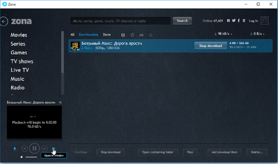 如果你是Popcorn Time的拥趸,你可以尝试Zona,因为它代替Popcorn Time的一个很好的选择,它允许每个人都可以轻松流畅地播放电影,追番剧,直播,音乐,电台,甚至免费玩游戏。点击侧边栏上的下载,然后点击"添加下载项目"来输入磁力链接或选择种子文件。当torrent开始后,您可以通过双击torrent来开始播放文件