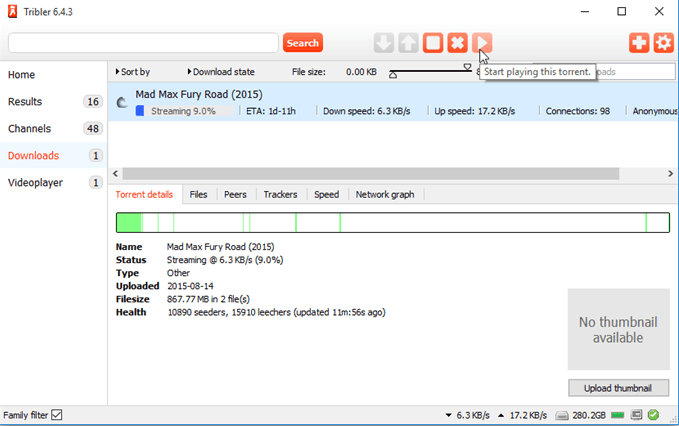 Tribler是一款BitTorrent客户端工具。可以在完全下载之前播放BT视频。选择你的BT文件,然后点击位于顶部的播放按钮。就可以在视频播放器中边下载边看。