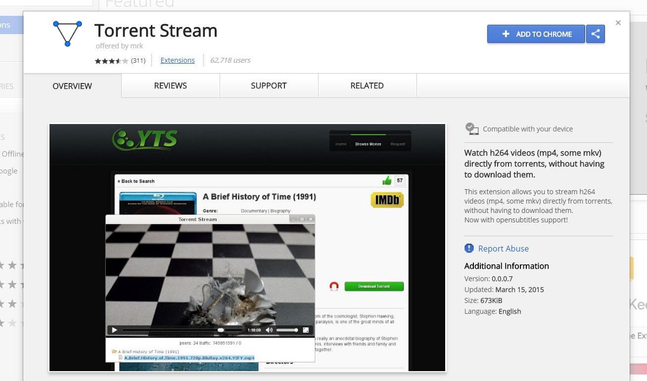 Torrent Stream一款谷歌Chrome浏览器扩展,可让你下载torrent传输电影。安装Torrent Stream扩展后。只需将磁力链粘贴到应用程序中。Torrent Stream将立即开始连接到Peer节点,下载缓缓冲一会后,就可以播放视频。