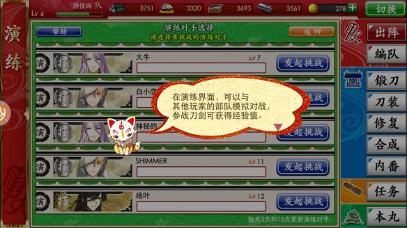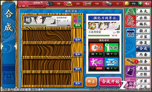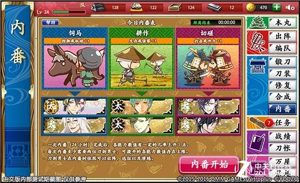 最后《刀剑乱舞-ONLINE-》中文版值得一提的点是婶婶们可以通过合成与内番来完善刀剑男士的4个属性点,包括:打击、防御、机动以及冲力。除了通过吃狗粮的方式提高刀剑男士的属性,还可以尝试内番,内番时间会较长,一次内番需要一天的时间。一次内番会随机增加1点属性,参与内番的刀剑男士是可以参加日常活动的。而且在内番的过程中,如果特定的两位刀剑男士会触发特殊对话,还是非常值得各位婶婶探索一下的。
