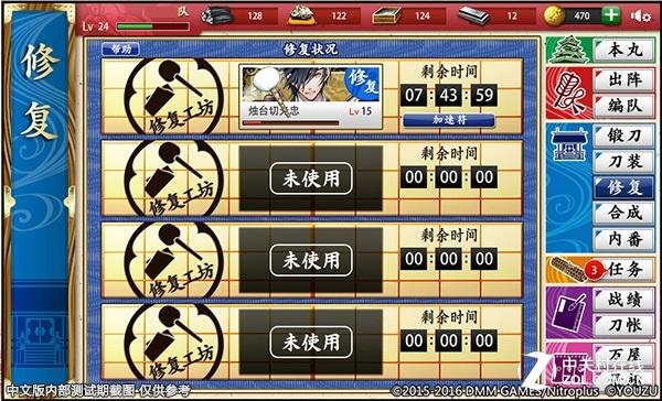 刀剑收到伤害时,是没有药品回复也不会自动回复的。婶婶进入修复系统为受伤的刀剑男士进行治疗。根据刀剑男士种类以及受伤的程度的不同,所需要的资源量和时间也不同。等不及的婶婶们可以使用加速符,但是加速符有限,个人建议可以用在锻刀上。需要注意的是,如果队伍中存在修复中的刀剑男士是不能出阵,远征等其他活动的。