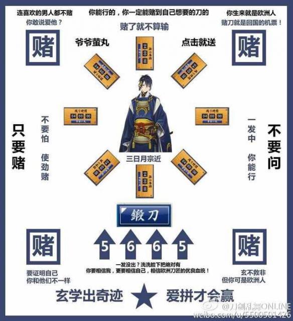 讲一讲游戏中刀剑的锻造:刀剑的锻造非常简单,在锻造屋进行锻造,然后给予锻造材料即可。而不同材料搭配所出来的刀剑会不一样~太刀,胁差,短刀,打刀甚至还有长枪等。当然,锻造不是即时锻造,根据材料的多少,锻造时间会不同。你相信吗?三小时后,这把新刀的名字叫“三日月宗近”!