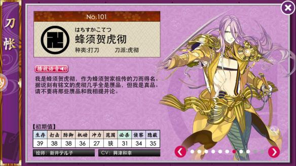 名刀的图谱(刀帐)给玩家带来的成就是满满的。而刀帐中,每位刀剑男子都有原画以及爆衣后的插画,可谓女性福利~同时可以聆听每位刀男声优给玩家带来的男朋友般的感受。