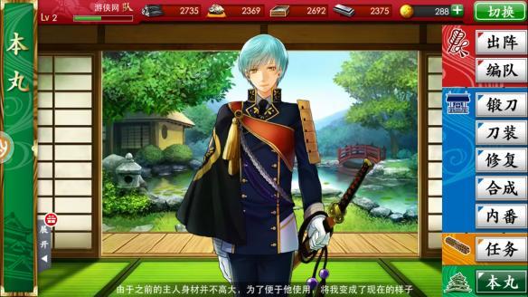 在一段爽快的CG之后,进入游戏的初始选单。随着一段新手教程,我们终于到了主界面。而清新简洁的背景布置加上大师手笔的原画,让人非常赏心悦目。因为游戏并没有非常华丽的3D建模,基本都是好看的贴图,没有锯齿,反而比很多目前的伪3D要漂亮的多。 背景音乐以明治维新时期的风格为主,偶尔几段非常日系的轻弹让人仿佛置身樱花瓣落下的宅屋之中,门外的竹筒滴水滴滴答,而屋内你的刀男与你轻声诉说。