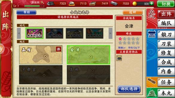 点击出阵界面后,我们即可进行主线剧情的玩法。本作的主线关卡选用维新时期的日本,在主线地图战役上,我们进行探索。如遇分岔路,则通过筛子来进行远征的方向。进行遭遇战后,我们需要消灭那些野鬼缠身的弃刀,一开始会让玩家选择阵型,我们选择有利阵型即可。如果刀男的侦查力不够高,则会无法获取敌方的阵型,而一个有利的阵型,会让战斗变得无比轻松。