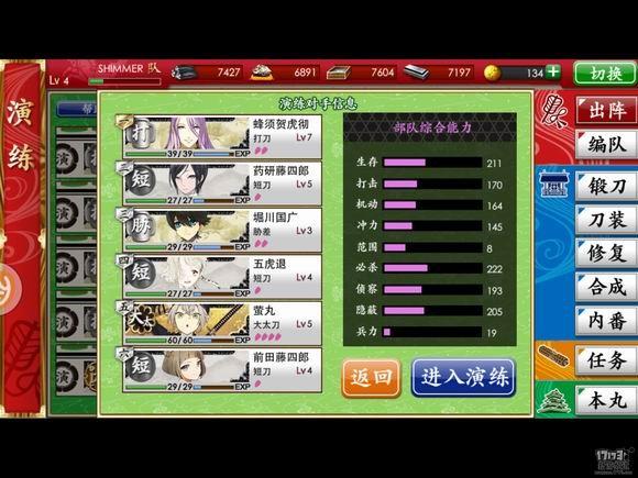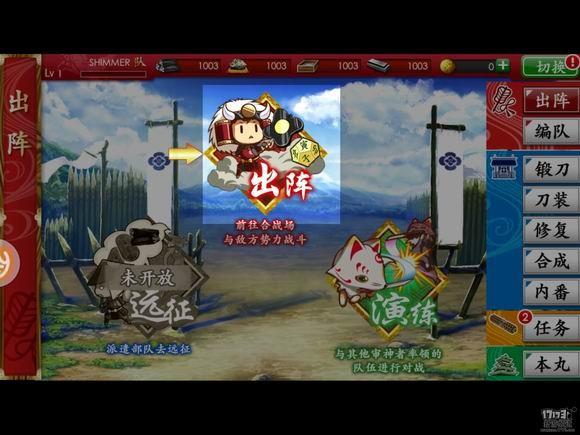 出阵界面中还有“远征”与“演武”两个选项,远征可以通俗理解为挂机,在工作学习娱乐之余,可以派队伍进行资源的收集,不需要玩家自动操控。 而演武,则是刀剑乱舞中的PVP,与AI或者玩家进行PK来磨练你的刀剑男子。