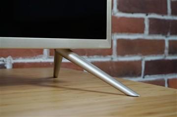 底座的造型已经很常见了,同样为香槟金色,与整体色调保持一致,而且具有浓郁的金属质感,看起来非常绚丽。另外从右侧图中还可以看到底部有一个实体五维导航键,设计得非常隐蔽,即使没有遥控器用它也可以对电视进行一些基本的操作。