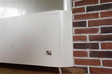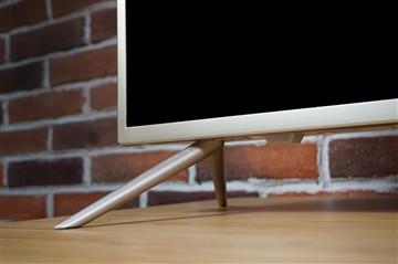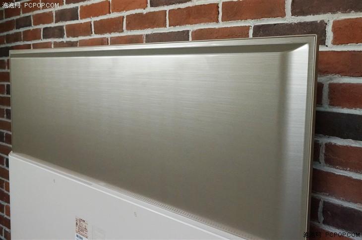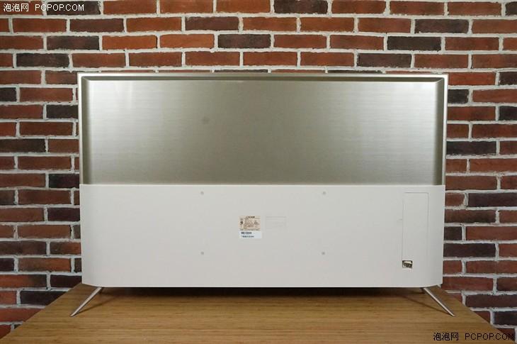 虽然边框比较窄,不过翻到电视背面可以看到它的背板还有一定的厚度,当然这不是重点,干净、整洁的背部是它的魅力所在,上半部分为金属镀晶拉丝背板,上面看不到任何螺钉的存在,下半部分为暖白色塑料材质,与电视整体风格非常协调,与那些采用黑色塑料材质的电视形成巨大的反差。