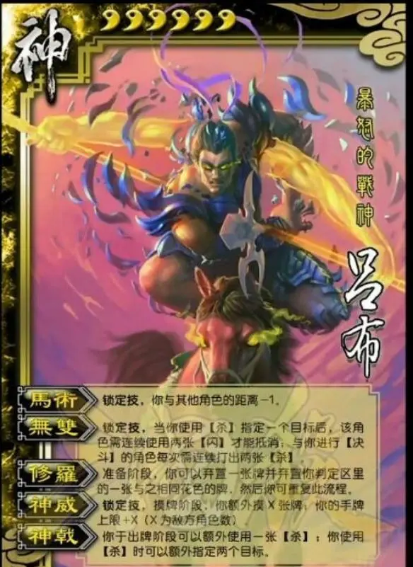 神躯是一个非常强的过牌技能,根本不用畏惧空牌,六血的上限搭配它就是用多少补多少,另一个技能极武也很强,强袭伤害,铁骑强中,旋风拆牌,完杀防奶妈,而且神鬼无前的高额过牌也足够供应极武。这个版本的神吕布才是真的神,过牌足还有万金油技能无双以及额外四个超强的技能,基本上能吊打三国杀所有的武将了。