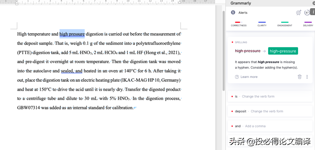 使用方法不再赘述,参见:一键帮你解决SCI论文语法错误——Grammarly英文润色软件。以下是Word中应用Grammarly 免费版(仅检查拼写、语法)的效果图: