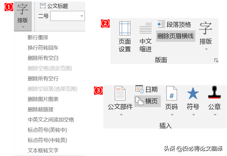 排除与word原生功能重复以及专用于公文写作的功能,小编给大家推荐能够显著提升论文排版效率的三大利器:文字排版中的若干快速设置、版面设置中的“删除页眉横线”以及插入中的插入横页。傻瓜式操作,便捷快速!
