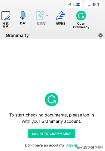 安装完成后菜单栏即出现“Open Grammarly” 的logo,直接点击登录即可使用。