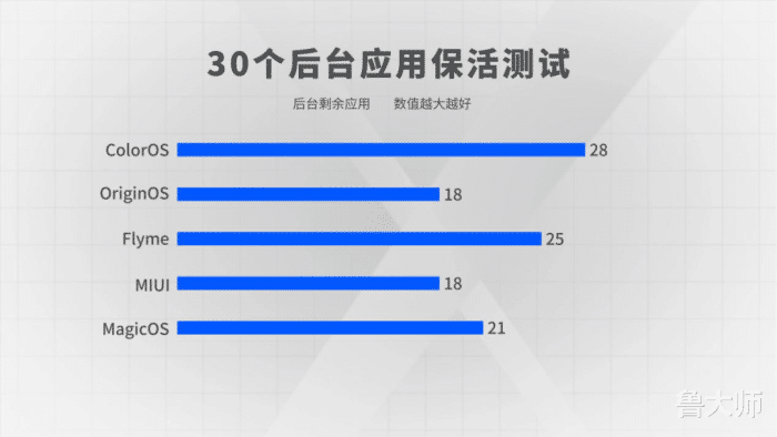 在30个后台应用的极限保活测试中,ColorOS仍旧表现优异,后台剩余应用有28个;Flyme排名第二,后台剩余应用25个;MagicOS排名第三,后台剩余应用21个。