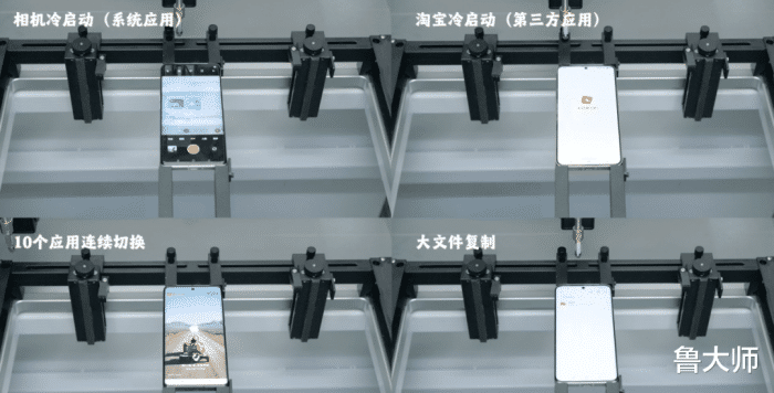 其中,软件测试即用户跑分数据,共有六个项目,用户下载鲁大师App便可自行体验;机器测试则是通过鲁大师实验室的高精度机械手臂和高速摄像机,对手机进行几十个项目的高强度测试。