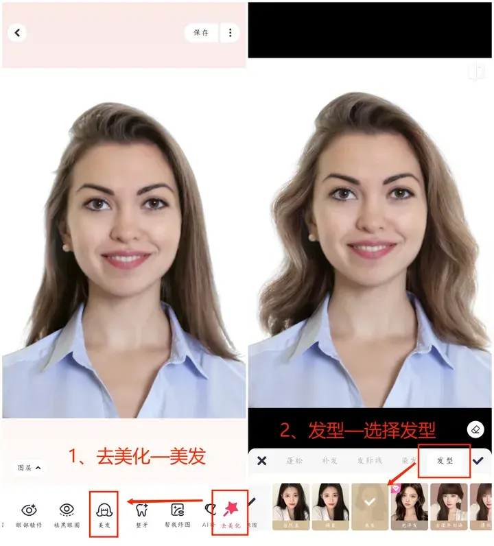 点击右下角的【去美化】,找到【美发】,再点击【发型】,就可以自由换发型啦~