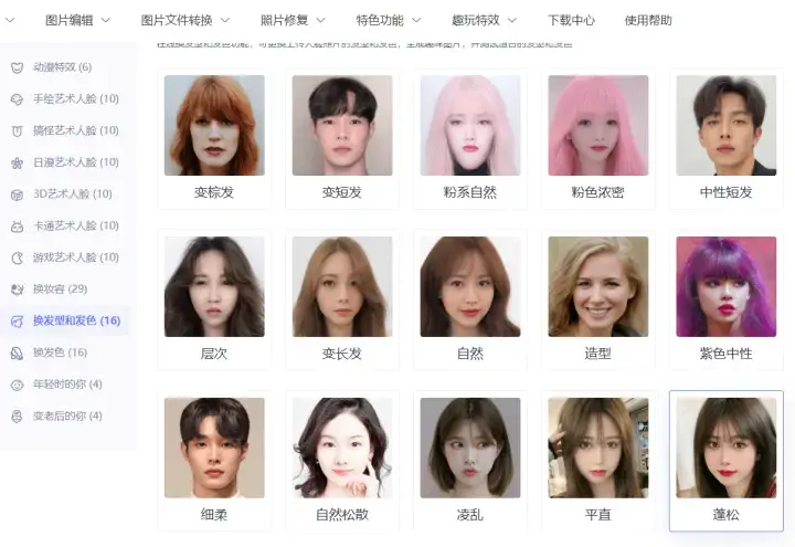 这款软件里面的百变发型特效,就可以帮助我们对真人照片进行换发想操作,并且软件里面还提供了16种发型模板供我们选择,我们除了可以换发型还可以进行换发色,很好的满足了我们多样化的需求。