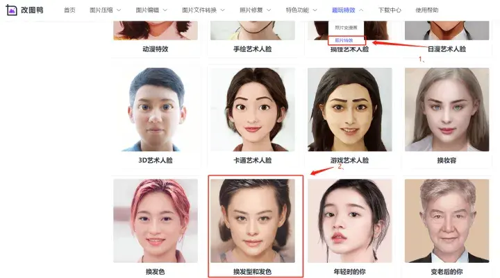 首先点击网站,选择上方功能栏的照片特效功能,然后找到换发型发色功能