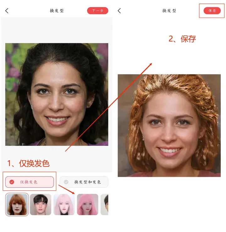 打开软件,选择【换发型】,上传图片,点击【仅换发色】下面的发型,软件就会自动开始换发型,最后点击【保存】即可~
