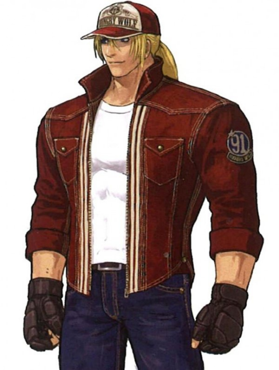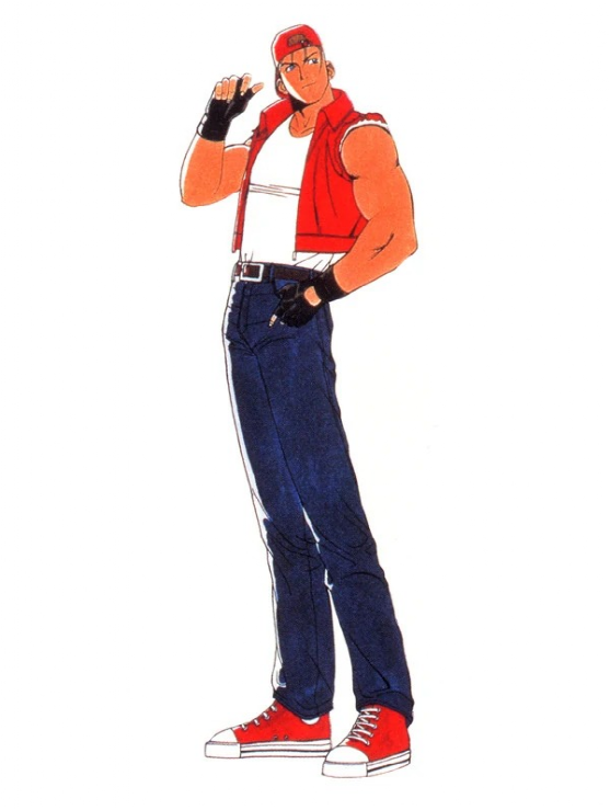 《饿狼传说1》里,初登场的特瑞就已经具备后来经典造型的大部分元素了,不同的是这时的红夹克袖子还在,鞋子也是纯白的,因为机器性能等原因,白色衣服与淡蓝牛仔裤的颜色在游戏中区别不是很明显。