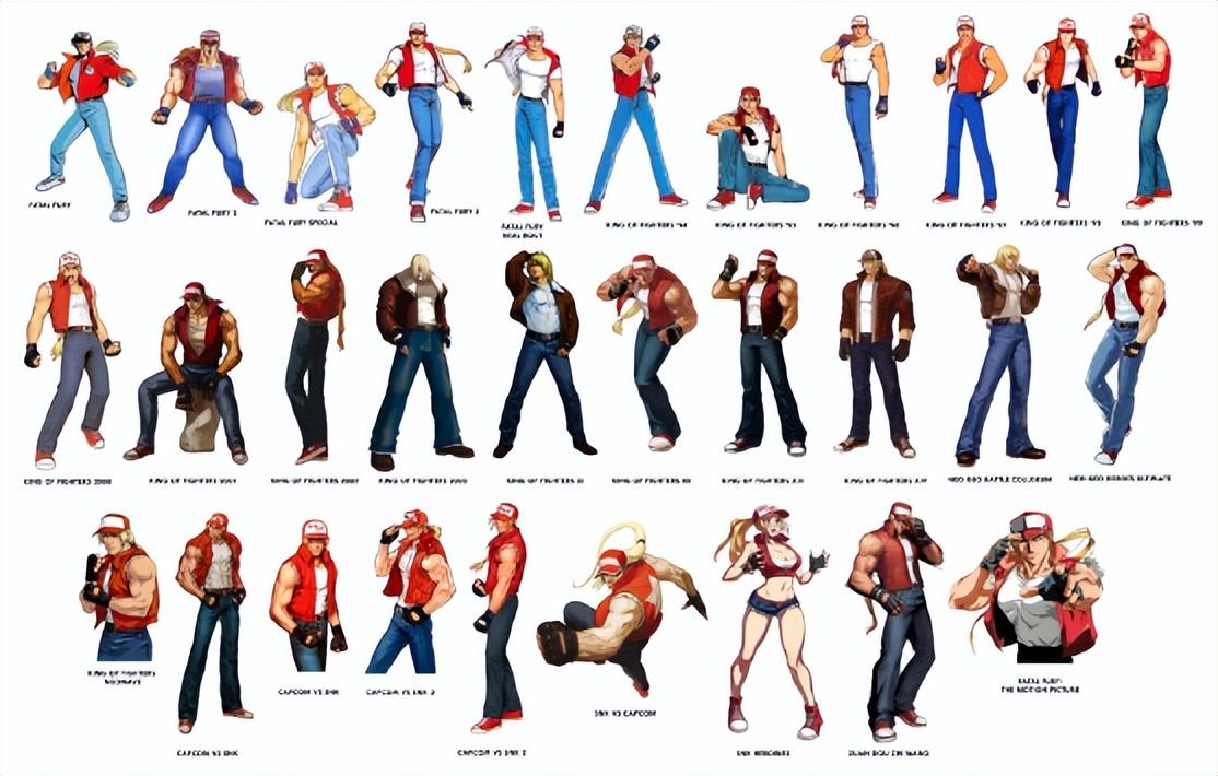 这个经典造型延续了许多代,一直到《拳皇2002》,之后就是《拳皇2003》里身穿棕色飞行夹克的“中年”版特瑞。