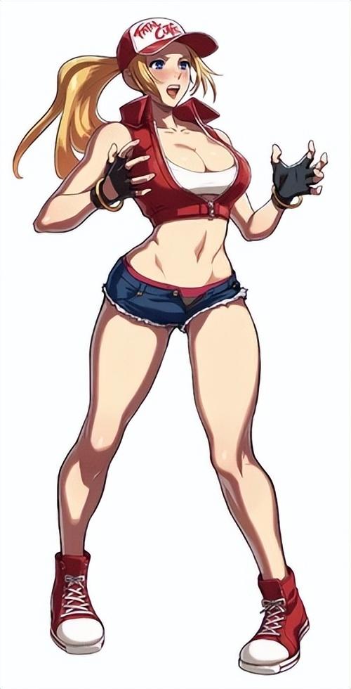 整体而言,在《饿狼传说》以及《拳皇》的正传作品中,特瑞的打扮变化不大,也都比较正经,但是在一些外传作品里就不一样了,比如《SNK女主角:组队狂怒》,特瑞就惨遭娘化,成了一位金发萌妹,衣着打扮也惨遭清凉化。