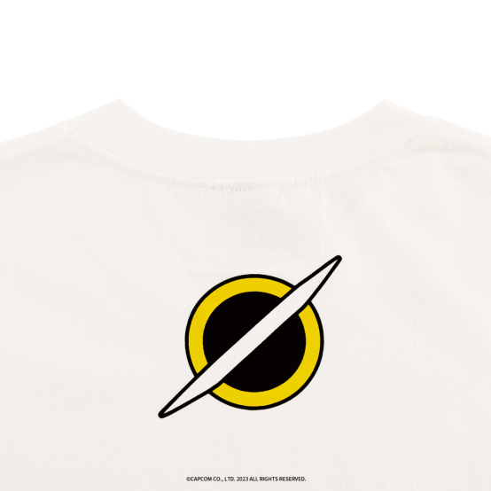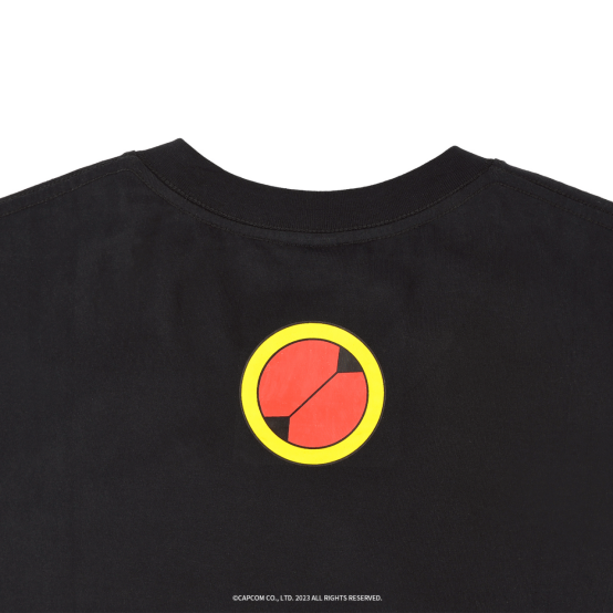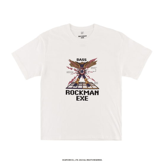 T恤正面是《洛克人EXE》中传说的存在,拥有自主意识的超级机兵——佛鲁迪,其蓄势待发的战斗姿态立于黄黑色交织的战斗场地之间,压迫感非常强!而在人物图案上,点缀了其英文译名“BASS”的像素风字样,昭示其强大的存在。而代表着他的图标也在T恤的背面有所呈现。