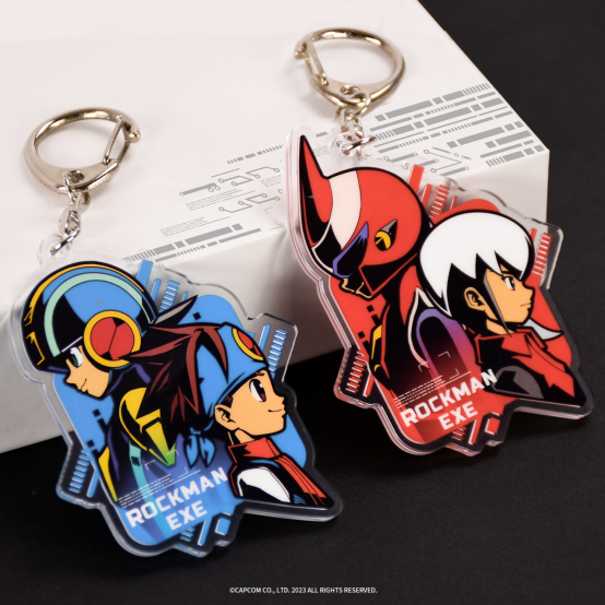以两大劲敌作为主题的钥匙扣组合,两款分别为主人公光热斗及其领航员洛克人、伊集院炎山及其领航员布鲁斯,采用了人物侧身像,背对而立,红蓝的颜色选择也符合人物个性。钥匙扣的背面分别有对应人物的图标。