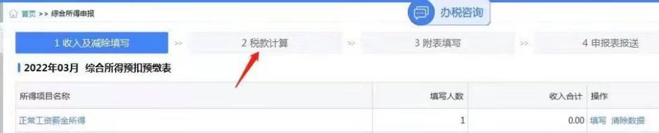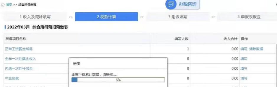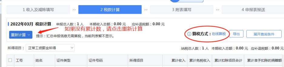(2) 办税人员正常进行综合所得申报,填写综合所得预扣预缴表;税款计算时,即会直接在线下载累计数。若无累计数,点击页面上【重新计算】即可。