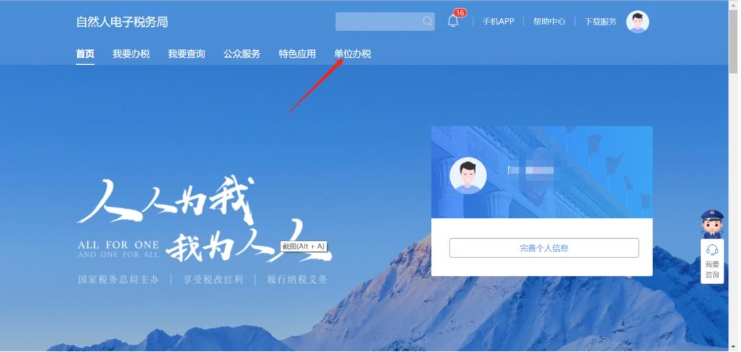 具有办税权限的办税人员登录WEB端后,点击首页上方的【单位办税】按钮即可进入操作界面。如果您是该单位的法定代表人或财务负责人,实名注册后可直接进行登录操作。