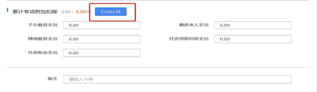 步骤二:如需获取该纳税人的累计专项附加扣除信息,要点击【自动计算】按钮来自动获取专项附加扣除额度(也可手动填写累计专项附加扣除信息。