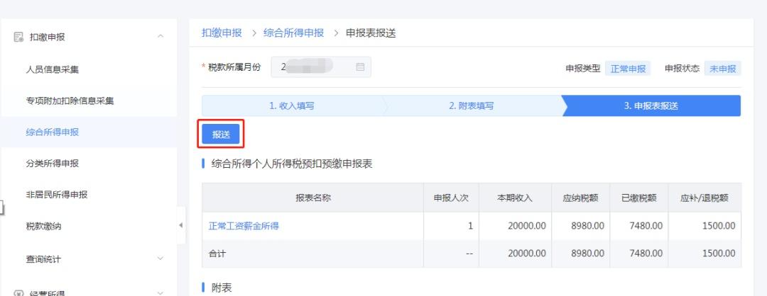 办税人员在首页功能菜单下点击【综合所得申报】,进入“综合所得申报”页面,选择需要申报的项目进行申报。