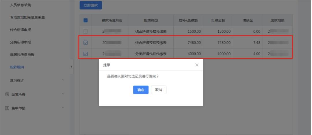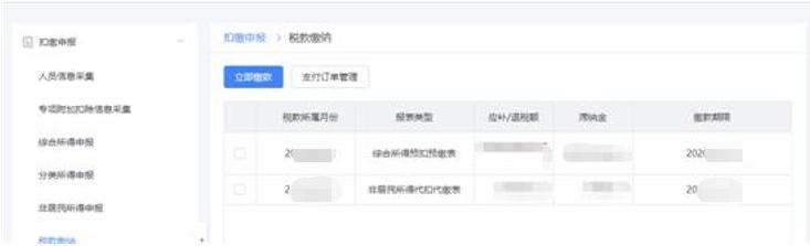 (2)进入【单位办税】—【扣缴申报】—【税款缴纳】—勾选需要缴纳税款的记录—点击【立即缴税】—跳转第三方缴税支付页面支付。