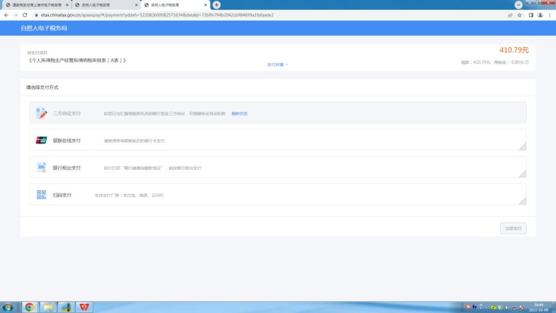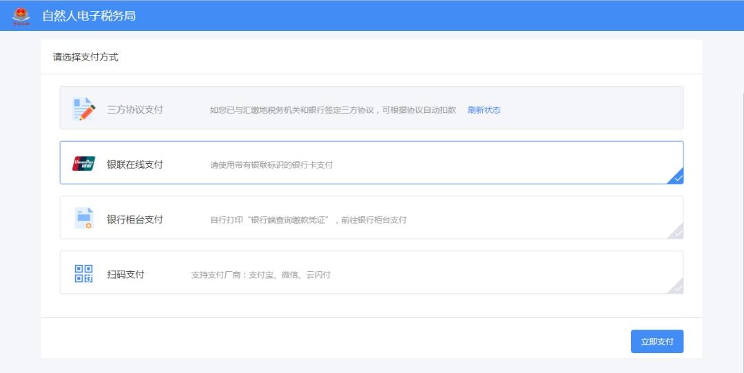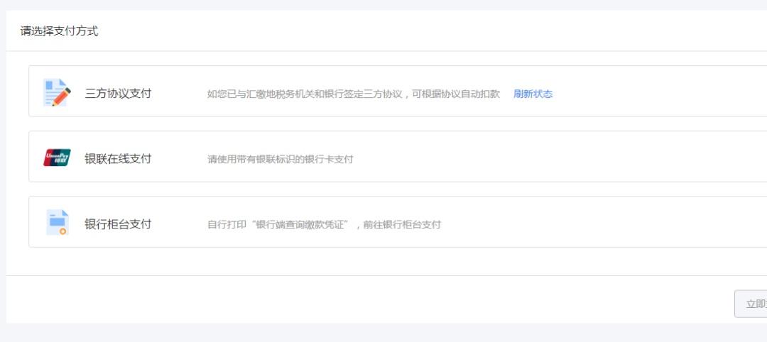 3.选择支付方式。(注意:个人签订过三方协议的,推荐三方协议支付,未签订并且税额在5万元以下的,推荐扫码支付,使用微信、支付宝等支付。