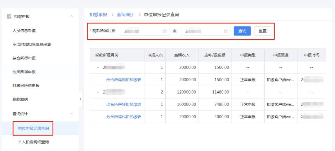 点击左侧菜单【扣缴申报】,再点击左侧功能菜单【查询统计】,在展开的功能中点击【单位申报记录查询】,选择税款所属月份,点击【查询】,即可查出该所属期扣缴单位的扣缴申报记录。