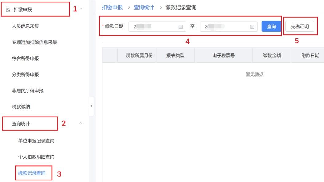 税款缴纳完成后,点击点击左侧菜单查询统计——输入所属期——点击查询——点击完税证明开具。