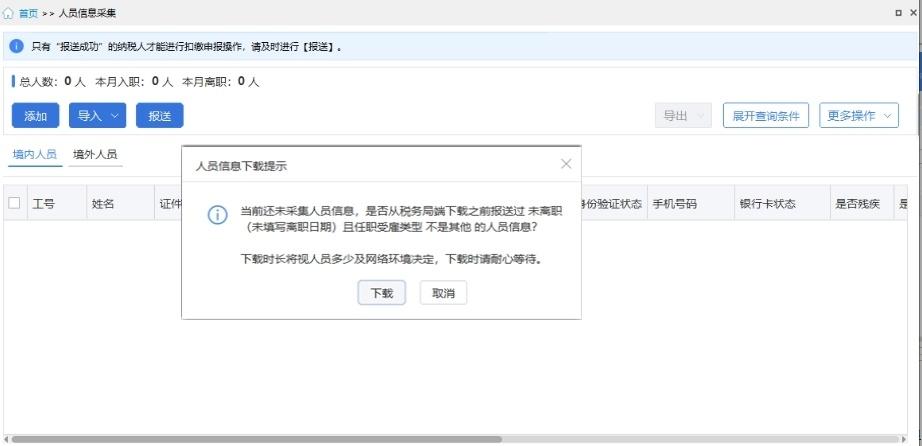 (4) 进入【人员信息采集】功能,点击“下载”,从税务局端获取之前报送过的人员信息;