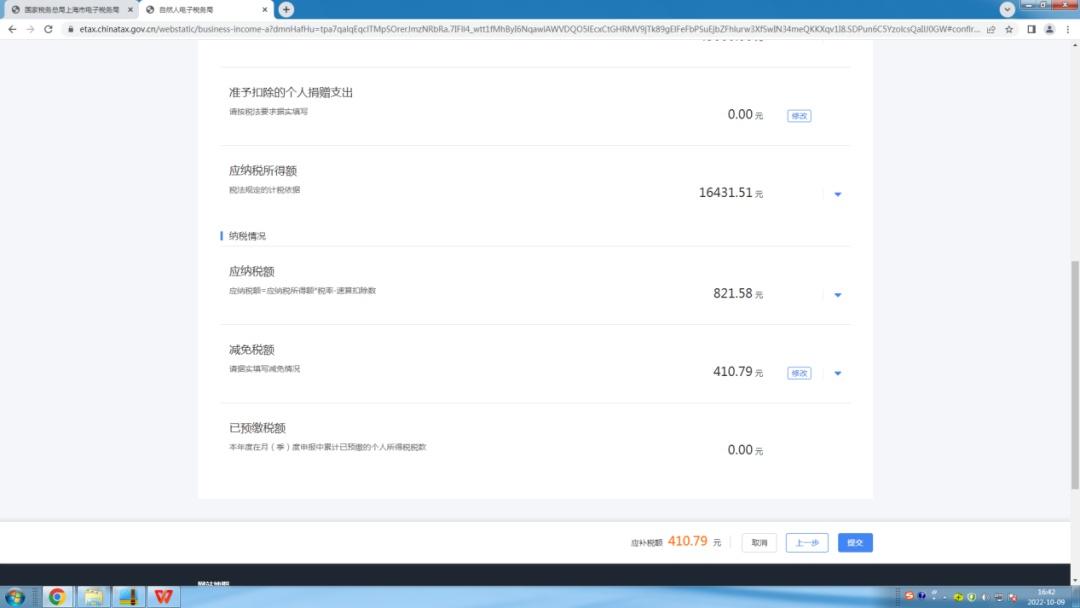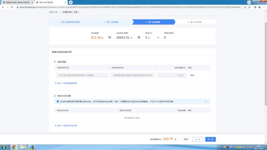 7.点击录入减免税额,点击【下一步】。(注意:系统自动判定并享受国家税务总局公告2021年第8号的个体工商户减半征收经营所得政策)