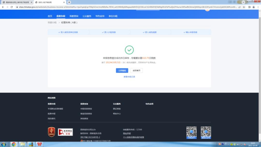1.申报成功后,若需要缴税,点击【立即缴税】。