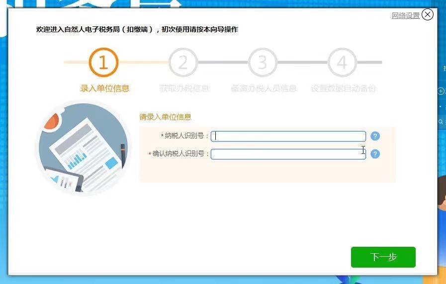 2.初次登录打开自然人电子税务局(扣缴端)——录入单位信息,输入纳税人识别号两次——点击【下一步】。