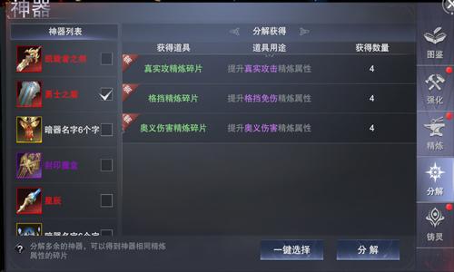 如果三条属性中没有奥义伤害,则可以先将这个神器佩戴,使用绑定魂晶开启精炼属性,直至开出奥义伤害属性后再替换下来进行分解。这一技巧同样适用于交易行购买神器进行分解的情况,玩家可以在购买前查看交易行上的道具tips,只挑选具有奥义伤害属性的神器购买即可。