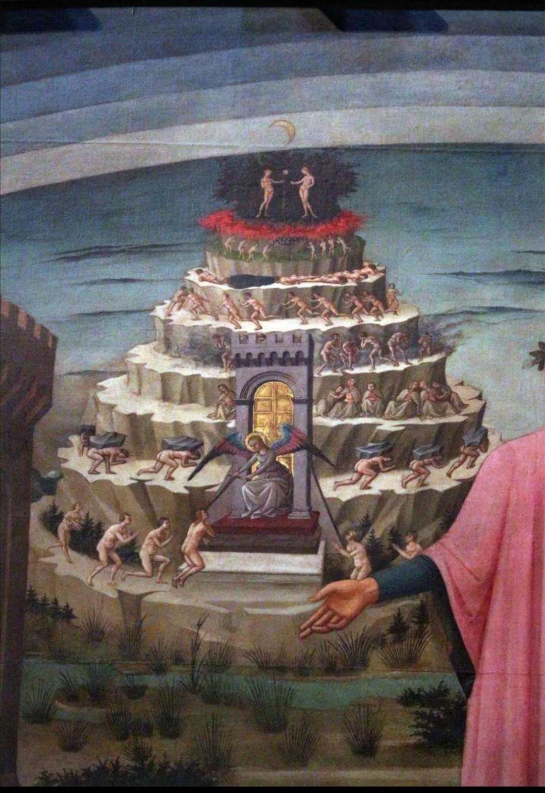地狱、炼狱、天堂的构造,对受罚、洗礼、享福的灵魂安排,在很大程度上是根据禁欲主义思想来体现的,尤其是“炼狱山”,实则就是一座“禁欲山”,他用来洗涤人类傲慢、嫉妒、愤怒、懒惰、守财、讲究吃喝、贪色这七种罪行。
