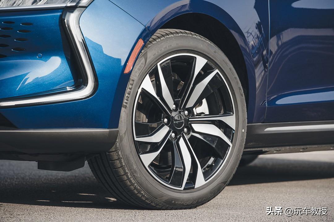 双色五辐造型的轮毂并没有像特斯拉一样使用了低风阻轮毂盖设计,整体感觉比较运动,255/45 R20的尺寸放在这样尺寸的SUV上也不显大。