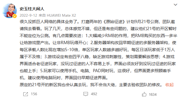 但巨人似乎偏不信邪。时隔多年,巨人集团创始人史玉柱重返业务一线,久违地为《原始征途》站台。据说他每天都会沉迷般地反复体验产品,然后大清早便在微信群里给项目组提建议。甚至在去年9月游戏已经官宣定档,正逐步发出预热物料时,他还临时做出了延期的决定。