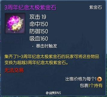 首先是超越3周年纪念太极紫金石的合成方法,需要原先第1周年、2周年的太极紫金石与3周年太极紫金石共同合成。具体合成公式见下图: