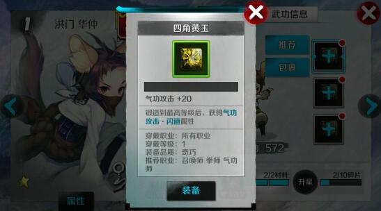 2. 黄玉:增加气功攻击,升级为六角后增加闪避属性